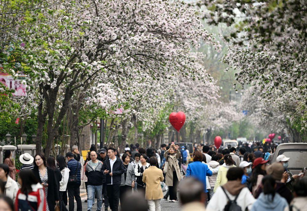 游客在海棠花盛开的五大道大理道上漫步休闲(4月7日摄)。