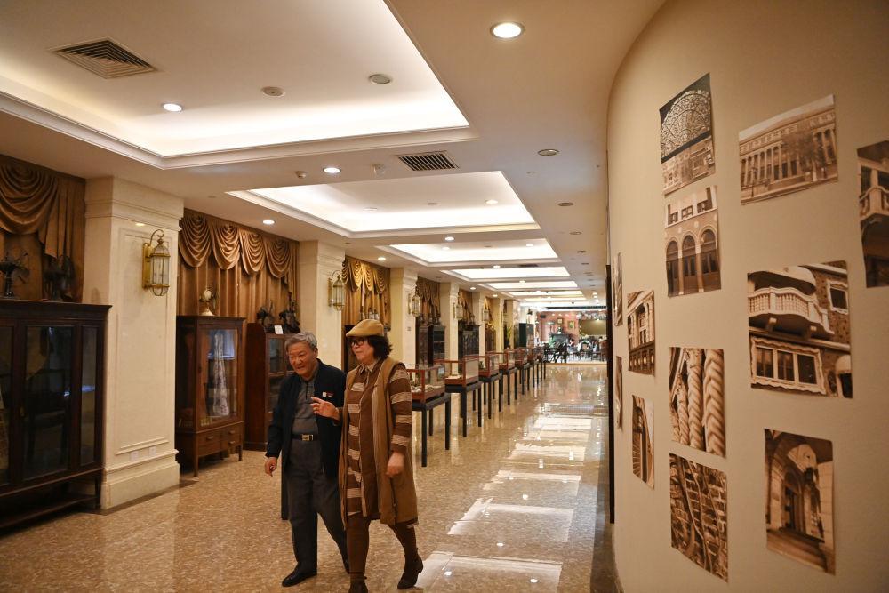 在五大道历史博物馆,金彭育(左)和馆长刘春芬互相交流(4月13日摄)。
