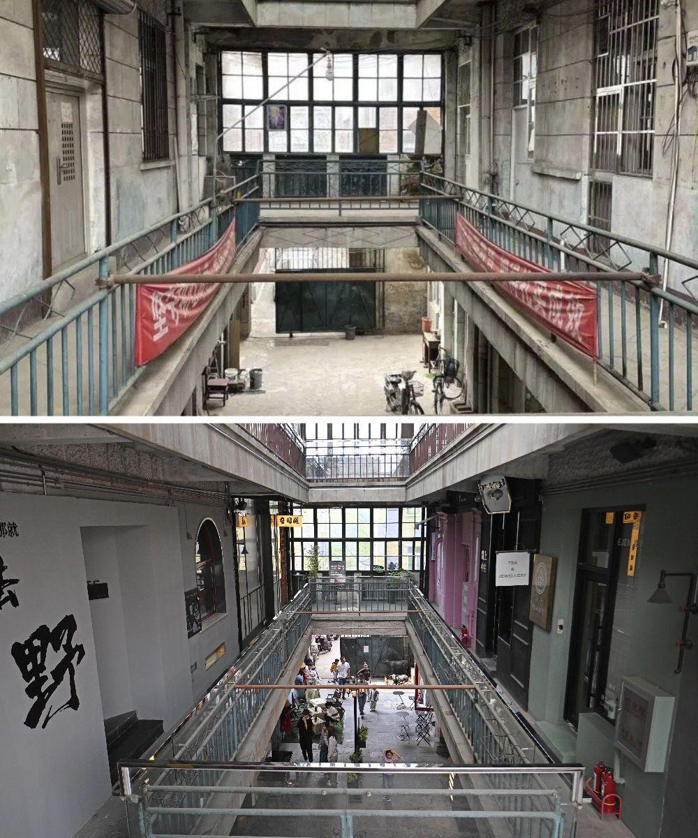 拼版照片:上图是改造前的先农大院(资料照片)。下图是游客在位于五大道的先农大院内游览(4月6日摄)。始建于1925年的先农大院是五大道建成最早的建筑群之一,融合了英式联排住宅、英式独栋别墅等多种特色的建筑风格。岁月变迁,这些建筑一度损坏严重,配套设施老化。2006年起,天津启动先农大院整理项目,对街区居民进行了腾迁,对建筑进行了加固修缮,恢复了街区的历史原貌,引进了餐饮、文化展示、办公等业态,使这里形成了环境优雅的公共艺术和展示建筑遗产的城市新空间。