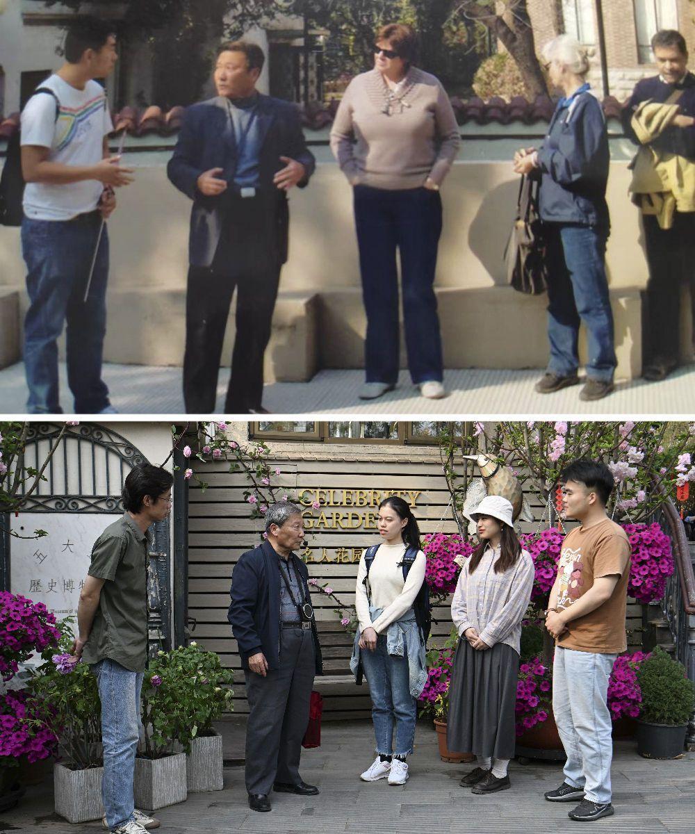 拼版照片:上图是2011年金彭育(左二)在五大道和平宾馆义务为外国游客讲解;下图是金彭育(左二)在五大道上为游客义务讲解(4月13日摄)。