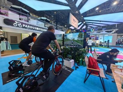 观众在第四届消博会上体验可模拟各种山地场景骑行的自行车。新华社记者吴茂辉 摄