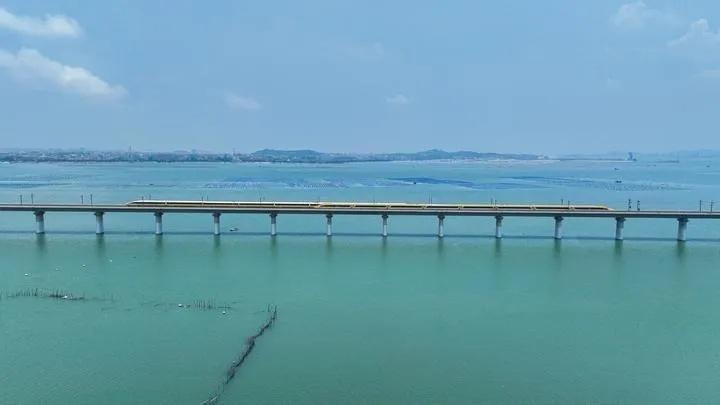 2023年6月28日,CR450动车组试验列车在湄洲湾跨海大桥交会运行,单列最高运行时速达到453公里。(铁科院集团公司供图)
