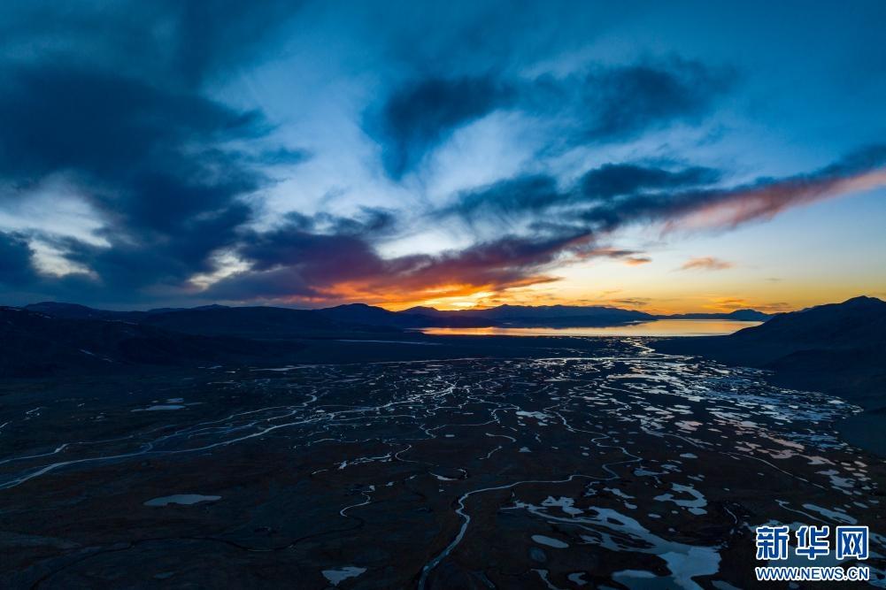 4月14日,傍晚从申扎县县城拍摄的色林错景致(无人机照片)。新华网 旦增努布 摄