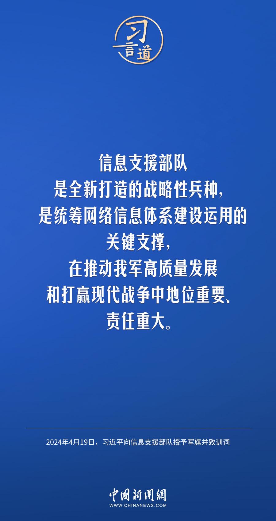 中国人民解放军信息支援部队成立大会19日在北京八一大楼隆重举行。中共中央总书记、国家主席、中央军委主席习近平向信息支援部队授予军旗并致训词,代表党中央和中央军委向信息支援部队全体官兵致以热烈祝贺。他强调——