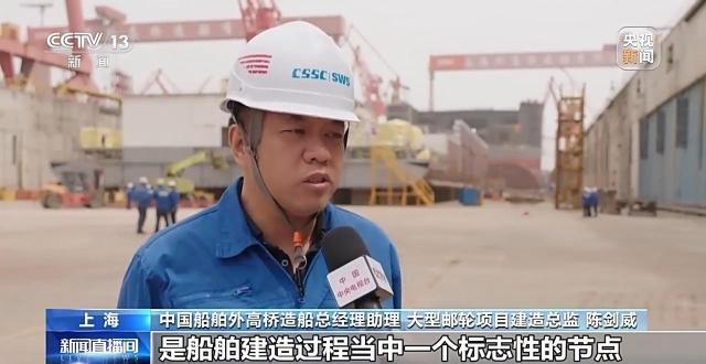 中国船舶外高桥造船总经理助理 大型邮轮项目建造总监 陈剑威:下坞是船舶建造过程当中一个标志性的节点,船舶下坞之后就代表着这个船后续要连续地搭载施工了,节奏会非常快。首制(艘)船交船之后,二号船这次下坞也标志着我国邮轮这个领域批量化设计建造能力基本形成了。