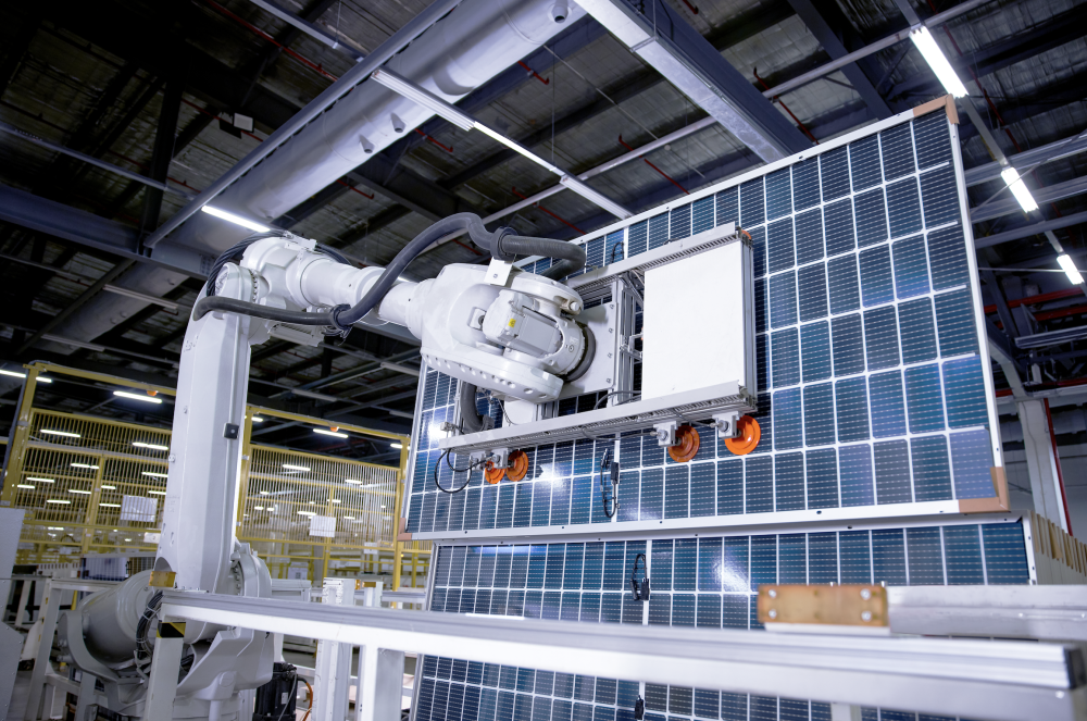 在浙江嘉兴的正泰新能科技股份有限公司的智能工厂内,一条条自动化生产线全力运转,随着机械臂上下挥舞,一批批太阳能光伏组件顺利下线,即将发往海外市场。