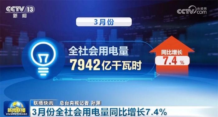 国家能源局发布数据显示,3月份,全社会用电量7942亿千瓦时,同比增长7.4%。其中,第一产业用电量同比增长7.0%,第二产业用电量同比增长4.9%,第三产业用电量同比增长11.6%,反映经济延续加快回升势头。