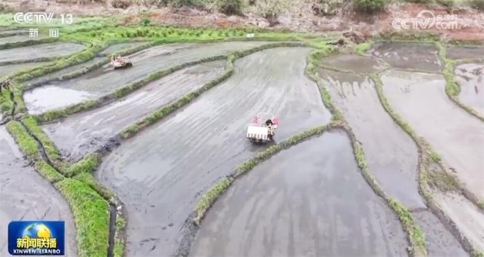 在江西莲花,小型插秧机正在梯田里来回穿梭。位于罗霄山脉的莲花县,三分之一的农田属于落差较大的山坡梯田。近年来,当地对这些梯田进行大力整合,修建机耕道,推进小型农机上山,提升农业生产效率,今年全县早稻栽种面积比去年增长了11%。