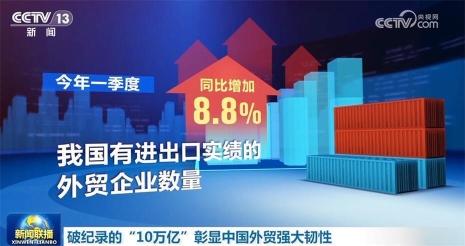 一季度,我国货物贸易进出口规模历史同期首次突破10万亿元,增速创6个季度以来新高。一季度进出口令人欣喜的数据彰显了中国外贸的强大韧性,提振了人们对实现今年经济增长目标的信心。
