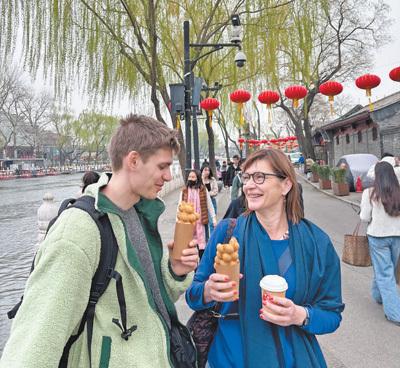 4月初,利用免签政策赴华旅游的比利时游客在北京后海品尝小吃。梵尚·沃姆摄