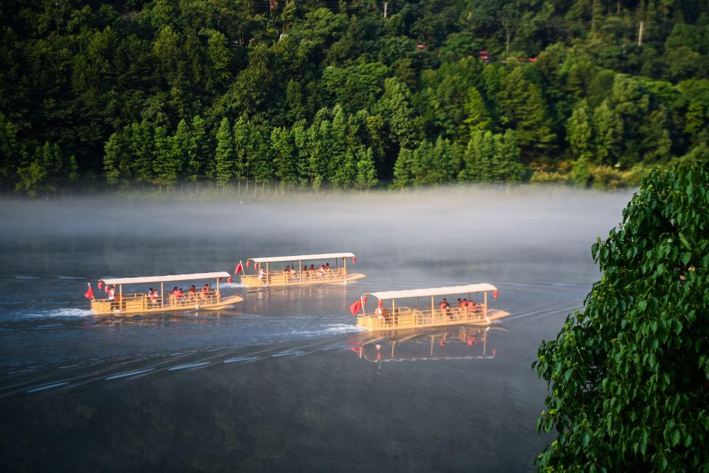 2023年7月16日清晨,游客乘坐“竹筏”造型电动游船,在浙江建德新安江的江雾中前行。新华社记者 徐昱 摄