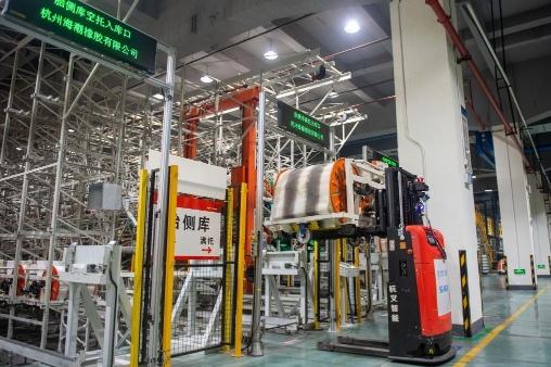 在杭州市钱塘区中策橡胶集团股份有限公司未来工厂内,无人叉车在运输产品(2024年2月23日摄)。新华社记者 江汉 摄