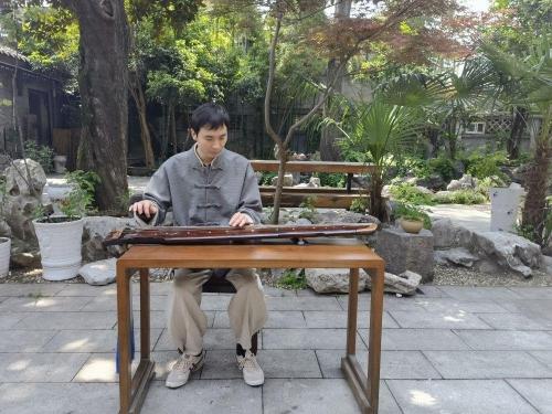 4月22日,扬州仁丰里的永乐琴坊中,古琴老师高廷鑫在弹奏《梅花三弄》。新华社记者 邱冰清 摄