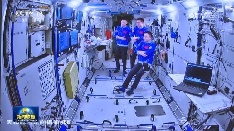 正在空间站执行任务的神舟十七号乘组在轨观看神舟十八号载人飞行任务新闻发布会和记者见面会。