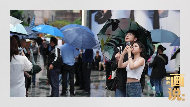 △细雨中的解放碑步行街,骑在父亲肩膀的小女孩好奇张望。