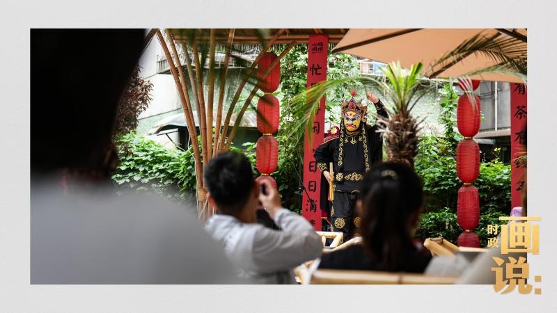△山城巷的露天茶座中,传统川剧变脸演出引得茶客们连连叫好。
