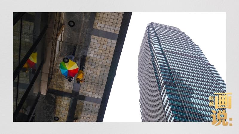 △高楼大厦掩映下的解放碑步行街,行人的雨伞映照在玻璃幕墙上,留下一抹亮色。