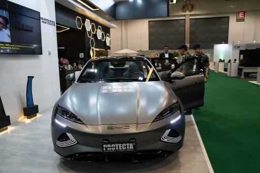 4月4日,在巴西圣保罗举行的巴西防务展上,参观者体验一辆经过防弹加固的比亚迪海豹电动汽车。新华社记者 王天聪 摄