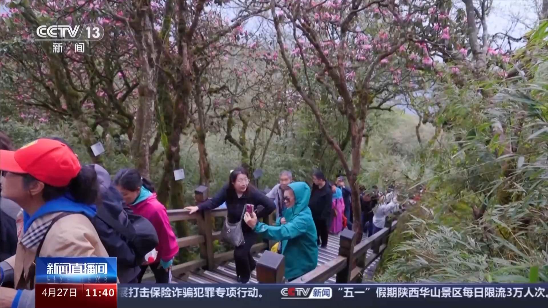 近日,在位于贵州铜仁的梵净山,杜鹃花次第绽放,吸引了不少游客前来观赏。
