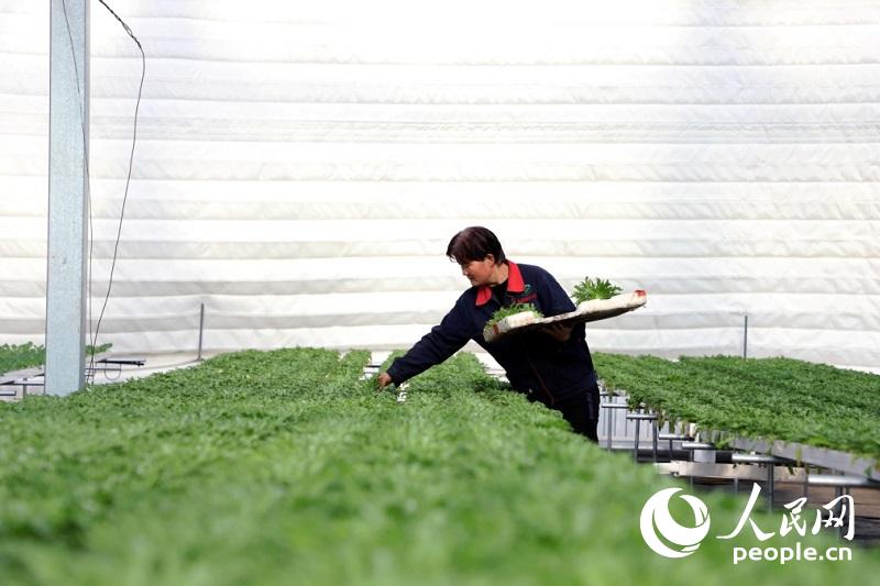 2021年12月,甘肃兰州市榆中康源现代设施农业生态示范园区里,一位工人正在打理水培蔬菜。人民网记者 王文嘉摄
