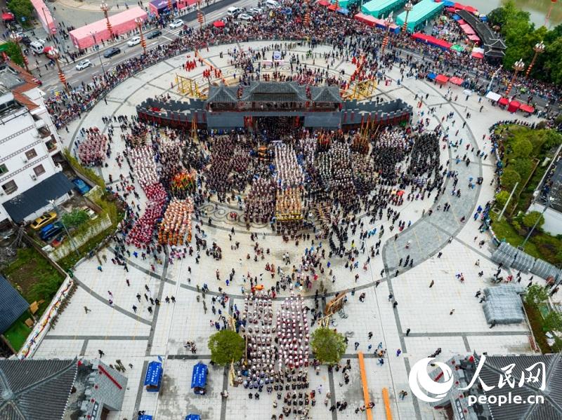 航拍贵州省台江县姊妹节万人盛装游演队伍。人民网 阳茜摄