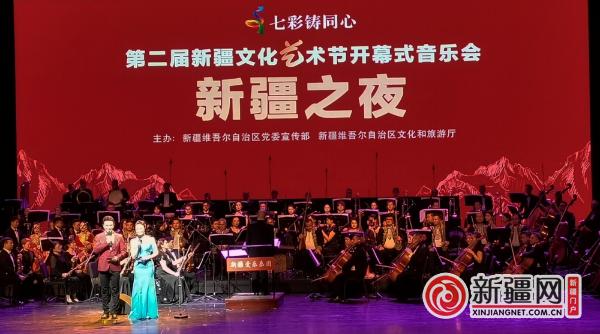 新疆网讯 4月26日晚,“七彩铸同心”第二届新疆文化艺术节开幕式在乌鲁木齐大剧院举办。本次开幕式以音乐会的形式呈现,邀请了北京爱乐汇交响乐团、新疆爱乐乐团附属合唱团,以及多位知名歌唱家参与表演,全场演绎了多个新疆的经典音乐作品。