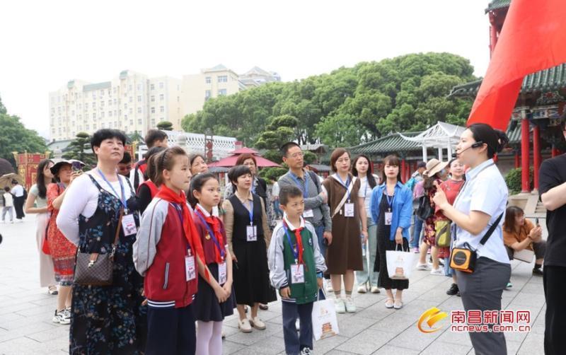 滕王阁是南昌重要的文化遗产,是南昌的城市文化名片与“城市会客厅”。当天上午10时许,采风团坐上大巴准时出发前往江南三大名楼之一、南昌地标——滕王阁。“滕王阁是江南三大名楼之一,因一首《滕王阁序》闻名千年之久……”在大巴上,南昌晚报《阳光少年》小记者、豫章教育集团学生王楚煊充当小小讲解员,为采风团介绍起滕王阁,“滕王阁是南昌的文化名片之一,至今已经重建了29次,千年来,无数人来到滕王阁,感受千年古阁的瑰伟绝特和壮美新景,品味南昌的城市文化氛围。”
