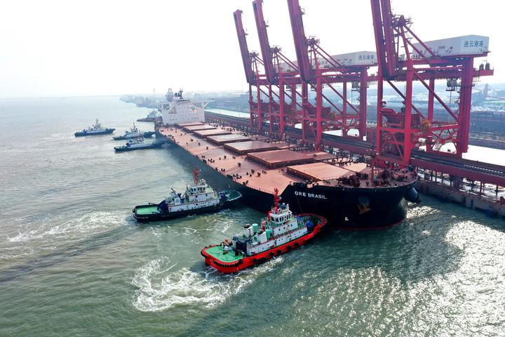 2023年12月19日,一艘满载40万吨铁矿石的“巴西矿石”轮缓缓停靠江苏连云港矿石码头卸货。新华社发(王春 摄)