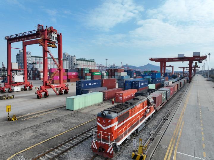 2024年1月8日,一列中欧班列满载集装箱准备从中哈(连云港)物流合作基地驶出。新华社发(王春 摄)