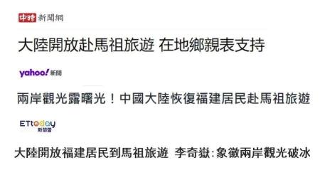 谭主注意到,这些消息迅速登上台湾各大媒体,引发热烈反响,岛内旅游业者、民代等各界人士直呼“两岸观光旅游破冰”“好事一件”“乐观其成”。
