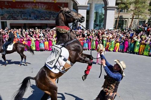 ↑4月30日,在新疆乌鲁木齐市举行的巡游活动上,汗血宝马方阵为观众带来马术表演。