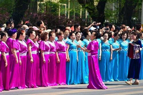 ↑这是4月30日在新疆乌鲁木齐市举行的巡游活动上拍摄的手风琴演奏及合唱表演。