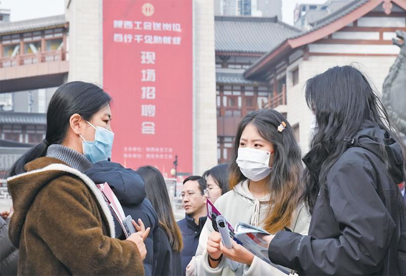 2024年3月6日,由陕西省总工会举办的2024年陕西工会“春送岗位”就业服务月启动仪式在西安举行。与启动仪式同期举办的现场招聘会吸引约200家用人单位参加,提供岗位超过5000个。图为当日求职者在现场招聘会上与企业工作人员交流。新华社记者 张博文/摄
