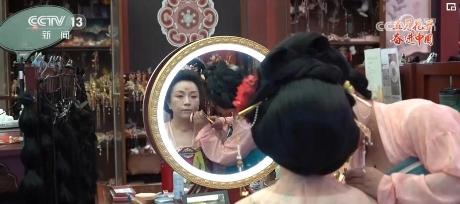 在陕西西安,有这样一位年轻人,她仿佛拥有一种复刻旧时光的魔力。敷粉、画眉、点唇,穿上汉服、戴上发饰,不到1个小时,一个现代的女孩就穿越回了汉唐。“00后”汉服妆造师胡芯银,让今人和古人在装束上相逢。 一抹柳叶眉,一头贵妃髻,在胡芯银的巧手之下,不到40分钟的时间,一个“杨贵妃”的妆造就完成了,胡芯银还专门在发髻上加上了古代饰物“步摇”。
