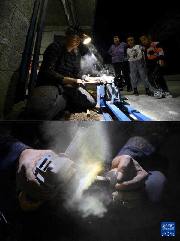 在广西大化瑶族自治县大化镇仁良村,非遗传承人韦寿基在制作陀螺(2023年4月16日摄)。作为当地传统陀螺手艺人,韦寿基经常组织村民进行陀螺比赛,积极传承非遗文化。
