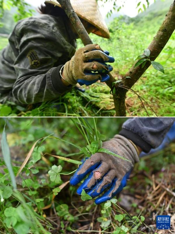 在广西柳州市融安县东起乡铜板屯,61岁的龙飞任在山上为果树除草(4月23日摄)。10多年来,龙飞任返乡创业,和村民们一起发展水果种植和观光旅游。