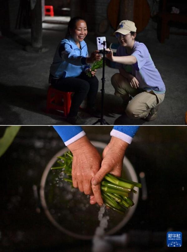 上图:在广西柳州市融水苗族自治县杆洞乡乌英苗寨,48岁的梁足英(左)向大学生学习直播带货;下图:梁足英在洗野菜,准备销往县城(4月30日摄)。近年来,她积极参加夜校学习,并通过网络直播销售当地蔬菜。