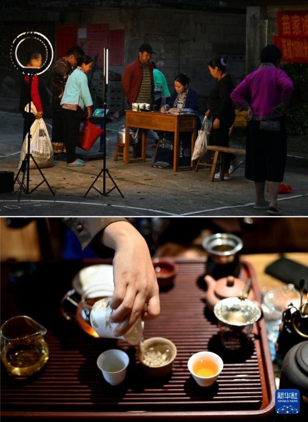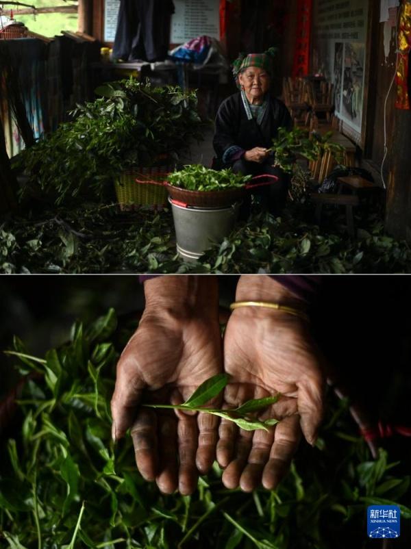 上图:在广西柳州市融水苗族自治县香粉乡中坪村,苗族姑娘贾宥凌(右三)在收茶叶;下图:贾宥凌在泡茶(4月20日摄)。2019年,贾宥凌返乡创业,借助直播和短视频销售大苗山的农副产品。