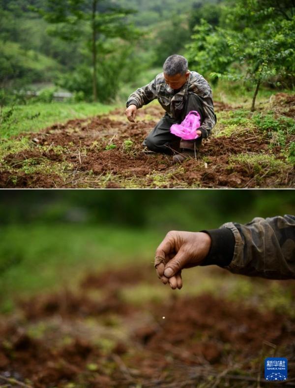 在广西柳州市融安县东起乡铜板屯,村民龙革雄在山上播种(4月23日摄)。10多年来,龙革雄返乡创业,和村民们一起发展水果种植和观光旅游。