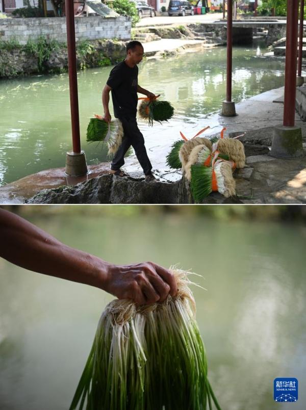 在广西柳州市柳江区三都镇觉山村,村民韦文中搬运香葱,准备供应市场(4月16日摄)。香葱种植产业是觉山村村民增收致富的支柱产业,韦文中种植10多亩香葱。