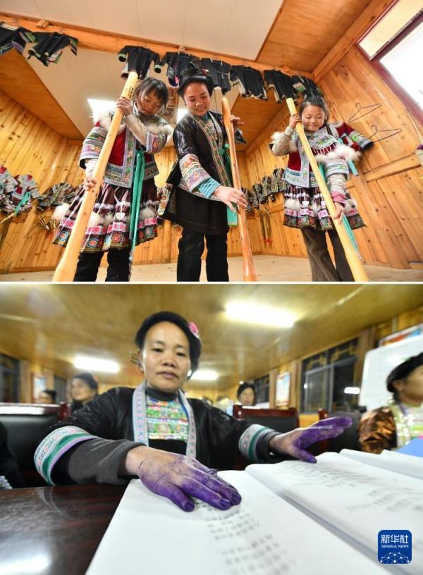 上图:在广西柳州市融水苗族自治县杆洞乡乌英苗寨,村民代时英(中)带领孩子们学习亮布文化知识(2024年1月31日摄);在广西柳州市融水苗族自治县杆洞乡乌英苗寨,白天制作亮布的村民代时英在夜校学习(2023年11月24日摄)。近年来,她积极参加夜校学习,带着孩子们传承民族文化。
