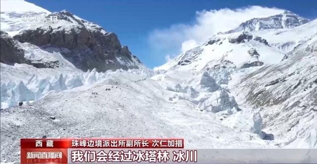 珠峰边境派出所副所长 次仁加措:往里走的话我们会经过冰塔林、冰川,穿越碎石滩,整个路途我们会花费8到12个小时,途中经过老大本营,那个地方是最危险的路段。
