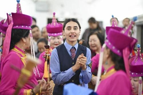 一名来自四川乐山的雕刻师(右一)向艾尔开牙·多力开(左二)带领的乘务组赠送书法作品“真水无香”,称赞乘务员们的辛勤付出。