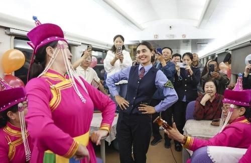在由喀什开往成都西的列车上,艾尔开牙·多力开与民间艺人一起为旅客跳舞。