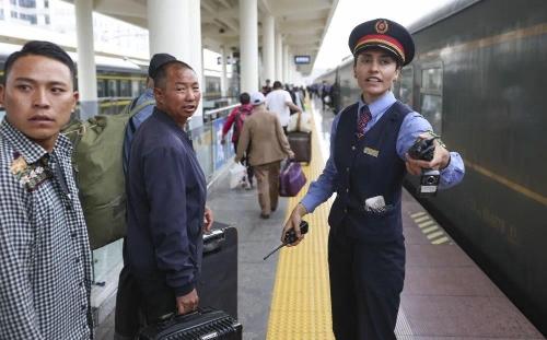 在成都西站,艾尔开牙·多力开(右)引导旅客登上由成都西开往喀什的列车。