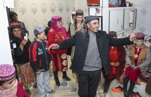在位于新疆塔什库尔干塔吉克自治县瓦恰乡夏布孜喀拉村的家中,父亲多力开·百尔飞克跳起舞蹈庆祝女儿回家探亲。