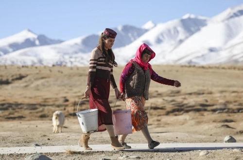 在新疆塔什库尔干塔吉克自治县瓦恰乡夏布孜喀拉村,艾尔开牙·多力开(左)帮母亲拎水。
