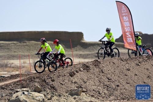 在新疆克拉玛依市乌尔禾区世界魔鬼城景区,小朋友们在自驾线路上体验自行车越野(5月1日摄)。