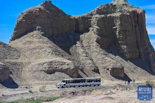 在新疆克拉玛依市乌尔禾区世界魔鬼城景区,游客乘坐观光车游览(5月2日摄)。