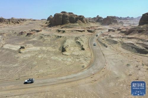 在新疆克拉玛依市乌尔禾区世界魔鬼城景区,车友在自驾线路上疾驰(5月1日摄,无人机照片)。